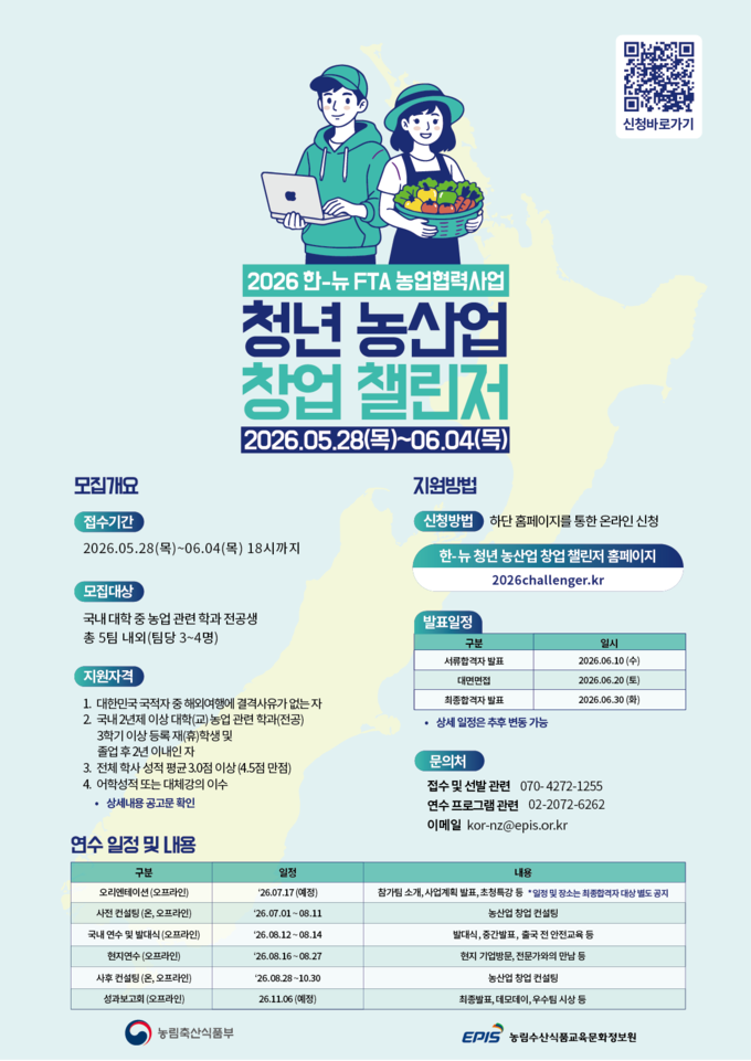 농정원은 16일부터 6월 4일까지 ‘2026년 청년 농산업 창업 챌린저 3기’ 참가자를 모집한다고 밝혔다. 해당 프로그램은 한-뉴질랜드 자유무역협정(FTA)에 따른 농업협력사업의 일환으로, 농업계 대학생의 창업 역량 강화를 위한 교육과 해외 연수를 제공하는 과정이다.