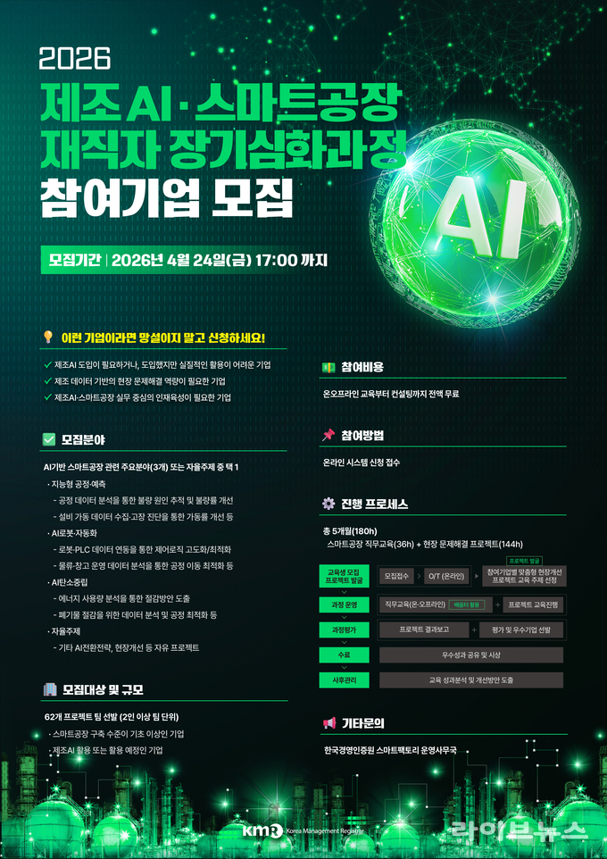 중소벤처기업진흥공단(이사장 강석진, 이하 중진공)이 ‘2026년 제조AI·스마트공장 재직자 장기심화과정’ 참여기업 모집에 나섰다. 스마트공장을 도입했거나 제조 현장의 디지털 전환을 준비 중인 중소기업이라면 실질적인 역량 강화를 기대할 수 있는 프로그램으로 평가된다. 신청을 고려하는 기업들을 위해 주요 내용을 정리했다.
