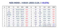 언론 통합 플랫폼이자 인터넷신문사 제보팀장을 운영 중인 더에이아이미디어는 12월 26일 NZSI INDEX 기반 시황 보고서를 발표했다. [편집자주] NZSI INDEX는 왜곡된 시장 정보에서 벗어나, 개인 투자자를 위한 공정하고 실질적인 투자 기준을 제시합니다. NZSI INDEX에는 미래를 설계할 수 있는 자본시장의 가능성이 담겨 있습니다. ★ 지수변경 : 1,000을 기준으로 종목 기여도 동일 반영 ★ 기 준 가 : 2024. 12. 20 / 1차 개편 : 2025. 04. 01 ★ 평가기준 : 20개 종목 X 5개 항목 (건전성, 안전성, 성장성, 위험도, 기대값) X 10등급 (A3 ~ D) 2025년 12월 26일 국내 증시는 상승세로 전환했다. 코스피 지수는 전 거래일 대비 0.51% 오른 4,129.68포인트를 기록했고, 코스닥 지수도 0.49% 상승한 919.67포인트로 마감했다. 연말을 앞두고 단기 낙폭 과대 인식과 기술적 반등이 맞물리며 지수가 소폭 회복하는 모습이었다. 거래대금은 집계 기준이 연평균에서 일별 금액으로 변경되며 크게 늘었다. 코스피 거래대금은 약 16조 3천억 원, 코스닥은 약 11조 3천억 원을 기록했다. 주가 상승과 함
