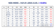 언론 통합 플랫폼이자 인터넷신문사 제보팀장을 운영 중인 더에이아이미디어는 12월 30일 NZSI INDEX 기반 시황 보고서를 발표했다. [편집자주] NZSI INDEX는 왜곡된 시장 정보에서 벗어나, 개인 투자자를 위한 공정하고 실질적인 투자 기준을 제시합니다. NZSI INDEX에는 미래를 설계할 수 있는 자본시장의 가능성이 담겨 있습니다. ★ 지수변경 : 1,000을 기준으로 종목 기여도 동일 반영 ★ 기 준 가 : 2024. 12. 20 / 1차 개편 : 2025. 04. 01 ★ 평가기준 : 20개 종목 X 5개 항목 (건전성, 안전성, 성장성, 위험도, 기대값) X 10등급 (A3 ~ D) 2025년 거래 마지막 날인 12월 30일 국내 증시는 소폭 하락세로 마감했다. 코스피 지수는 전 거래일 대비 0.15% 내린 4,214.17포인트를 기록했고, 코스닥 지수도 0.76% 하락한 925.47포인트로 장을 마쳤다. 거래대금은 코스피 약 13조 2천억 원, 코스닥 약 10조 5천억 원으로 전일 대비 크게 감소하며, 전날 급등에 따른 차익 실현과 연말 관망 심리가 함께 작용한 하루로 읽힌다. 시가총액은 코스피 3,460조 1천억 원, 코스닥 496조 4