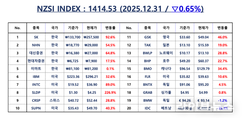 언론 통합 플랫폼이자 인터넷신문사 제보팀장을 운영 중인 더에이아이미디어는 12월 31일 NZSI INDEX 기반 시황 보고서를 발표했다. [편집자주] NZSI INDEX는 왜곡된 시장 정보에서 벗어나, 개인 투자자를 위한 공정하고 실질적인 투자 기준을 제시합니다. NZSI INDEX에는 미래를 설계할 수 있는 자본시장의 가능성이 담겨 있습니다. ★ 지수변경 : 1,000을 기준으로 종목 기여도 동일 반영 ★ 기 준 가 : 2024. 12. 20 / 1차 개편 : 2025. 04. 01 ★ 평가기준 : 20개 종목 X 5개 항목 (건전성, 안전성, 성장성, 위험도, 기대값) X 10등급 (A3 ~ D) 2025년 거래 마지막 날인 12월 31일, 국내 증시는 연말 휴장으로 문을 열지 않았다. 연초부터 이어진 가파른 상승 흐름 속에서 시장은 한 해를 마무리하며 잠시 숨을 고르는 모습이었다. 해외 증시는 뚜렷한 방향성 없이 약세 흐름을 이어갔다. 미국 다우존스 산업평균지수는 0.63% 하락한 48,063.29포인트로 마감했고, 나스닥 종합지수도 0.76% 내린 23,241.99포인트를 기록했다. 이날 NZSI INDEX는 0.65% 하락한 1,414.53포인트로