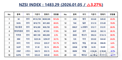 언론 통합 플랫폼이자 인터넷신문사 제보팀장을 운영 중인 더에이아이미디어는 1월 5일 NZSI INDEX 기반 시황 보고서를 발표했다. [편집자주] NZSI INDEX는 왜곡된 시장 정보에서 벗어나, 개인 투자자를 위한 공정하고 실질적인 투자 기준을 제시합니다. NZSI INDEX에는 미래를 설계할 수 있는 자본시장의 가능성이 담겨 있습니다. ★ 지수변경 : 1,000을 기준으로 종목 기여도 동일 반영 ★ 기 준 가 : 2024. 12. 20 / 1차 개편 : 2025. 04. 01 ★ 평가기준 : 20개 종목 X 5개 항목 (건전성, 안전성, 성장성, 위험도, 기대값) X 10등급 (A3 ~ D) 2026년 1월 5일 국내 증시는 연초 랠리를 이어가며 강한 상승세를 지속했다. 코스피 지수는 전 거래일 대비 3.43% 오른 4,457.52포인트를 기록했고, 코스닥 지수도 1.26% 상승한 957.50포인트로 장을 마쳤다. 연초 이후 위험자산 선호 심리가 강화되면서 지수 전반이 빠르게 고점을 높이는 흐름이 이어지고 있다. 거래대금 역시 전일에 이어 뚜렷하게 증가했다. 코스피 거래대금은 약 22조 7천억 원, 코스닥은 약 11조 7천억 원으로 집계되며 지수 상승을