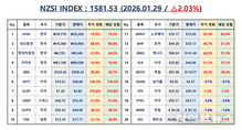 언론 통합 플랫폼이자 인터넷신문사 제보팀장을 운영 중인 더에이아이미디어는 1월 29일 NZSI INDEX 기반 시황 보고서를 발표했다. [편집자주] NZSI INDEX는 왜곡된 시장 정보에서 벗어나, 개인 투자자를 위한 공정하고 실질적인 투자 기준을 제시합니다. NZSI INDEX에는 미래를 설계할 수 있는 자본시장의 가능성이 담겨 있습니다. ★ 지수변경 : 1,000을 기준으로 종목 기여도 동일 반영 ★ 기 준 가 : 2024. 12. 20 / 1차 개편 : 2025. 04. 01 ★ 평가기준 : 20개 종목 X 5개 항목 (건전성, 안전성, 성장성, 위험도, 기대값) X 10등급 (A3 ~ D) 2026년 1월 29일 국내 증시는 상승 흐름을 지속했다. 코스피 지수는 전 거래일 대비 0.98% 상승한 5,221.25포인트, 코스닥 지수는 2.73% 오른 1,164.41포인트로 마감했다. 이날 코스피 거래대금은 약 28조 5천억 원, 코스닥은 약 17조 6천억 원으로 집계됐으며, 시가총액은 코스피 4,297조 7천억 원, 코스닥 625조 8천억 원으로 국내 주식시장 전체 규모는 연일 사상 최고치를 경신했다. 해외 증시는 혼조세를 보였다. 미국 다우존스 산업