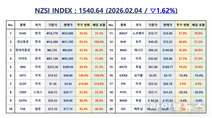 언론 통합 플랫폼이자 인터넷신문사 제보팀장을 운영 중인 더에이아이미디어는 2월 4일 NZSI INDEX 기반 시황 보고서를 발표했다. [편집자주] NZSI INDEX는 왜곡된 시장 정보에서 벗어나, 개인 투자자를 위한 공정하고 실질적인 투자 기준을 제시합니다. NZSI INDEX에는 미래를 설계할 수 있는 자본시장의 가능성이 담겨 있습니다. ★ 지수변경 : 1,000을 기준으로 종목 기여도 동일 반영 ★ 기 준 가 : 2024. 12. 20 / 1차 개편 : 2025. 04. 01 ★ 평가기준 : 20개 종목 X 5개 항목 (건전성, 안전성, 성장성, 위험도, 기대값) X 10등급 (A3 ~ D) 2026년 2월 4일 국내 증시는 상승 흐름을 이어갔다. 코스피 지수는 전 거래일 대비 1.57% 오른 5,371.10포인트, 코스닥 지수는 0.45% 상승한 1,149.43포인트로 마감했다. 거래대금은 코스피 30조 4천억 원, 코스닥 13조 4천억 원을 기록했다. 시가총액은 코스피 4,420조 9천억 원, 코스닥 618조 9천억 원으로 국내 주식시장 전체 규모는 다시 한 번 사상 최고치를 경신했다. 국내 시장은 여전히 유동성과 기대 심리에 의해 지수를 끌어올리는
