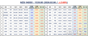 언론 통합 플랫폼이자 인터넷신문사 제보팀장을 운영 중인 더에이아이미디어는 2월 6일 NZSI INDEX 기반 시황 보고서를 발표했다. [편집자주] NZSI INDEX는 왜곡된 시장 정보에서 벗어나, 개인 투자자를 위한 공정하고 실질적인 투자 기준을 제시합니다. NZSI INDEX에는 미래를 설계할 수 있는 자본시장의 가능성이 담겨 있습니다. ★ 지수변경 : 1,000을 기준으로 종목 기여도 동일 반영 ★ 기 준 가 : 2024. 12. 20 / 1차 개편 : 2025. 04. 01 ★ 평가기준 : 20개 종목 X 5개 항목 (건전성, 안전성, 성장성, 위험도, 기대값) X 10등급 (A3 ~ D) 2026년 2월 6일 국내 증시는 하락세를 이어갔다. 코스피 지수는 전 거래일 대비 1.44% 하락한 5,089.14포인트, 코스닥 지수는 2.49% 내린 1,080.77포인트로 마감했다. 거래대금은 코스피 32조 4천억 원, 코스닥 13조 9천억 원을 기록했고, 시가총액은 코스피 4,185조 6천억 원, 코스닥 582조 1천억 원으로 집계됐다. 외국인 자금의 순매도 흐름과 환율 변동성이 겹치면서 단기 수급 압력이 지수를 끌어내린 구조였다. 반면 미국 증시는 상승