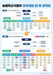 농림축산식품부(장관 송미령, 이하 농식품부)는 농정을 혁신하고 국민주권 정부의 농정 비전인 ‘국민과 함께하는 농업, 희망을 실현하는 농촌’ 조기 구현을 뒷받침하기 위해 조직을 확대·개편한다. 농식품부는 이번 조직 개편을 통해 1관 신설, 1국(관) 대체 신설, 21명 증원함으로써 기존 3실, 2국·12관, 59과·팀에서 3실, 3국·12관, 62과·팀 체계로 확대되며, 2017년 방역정책국 신설(순증), 2022년 동물복지환경정책관 신설(대체신설) 이후 3년여 만에 대규모 조직개편을 단행하게 됐다. ① 농어촌 기본소득, 농촌 에너지 전환을 전담하는 ‘농촌소득에너지정책관’을 신설한다. 신설되는 농촌소득에너지정책관에 기존 공익직불정책과·재해보험정책과·농촌탄소중립정책과를 이관하면서, 과 명칭을 변경하고 2개 팀을 신설하여 농촌소득정책과·농업정책보험과·농촌에너지정책과·농업재해지원팀·농촌탄소중립추진팀으로 확대·개편한다. 이를 통해 소멸 위기 농어촌 지역의 활력을 제고하기 위한 농어촌 기본소득 시범사업과 농촌의 재생에너지 확산을 위한 햇빛소득마을 조성, 영농형태양광 제도화 등 새 정부 핵심 정책을 속도감 있게 추진할 수 있는 동력을 확보하고, 기후위기에 따른 농업재해의