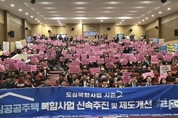 11월 1일 의원회관 대회의실에서 열린 <도심공공주택 복합사업 신속추진 및 제도개선 촉구 결의대회>에 서영교(서울 중랑구갑), 전현희(서울 중구성동구갑), 박주민(서울 은평구갑), 오기형(서울 도봉구을), 김남근(서울 성북구을), 김동아(서울 서대문구갑) 국회의원과 중랑구를 비롯한 전국 49개 사업지 주민대표 및 관계자 약 1천명이 참석했다. 도심공공주택 복합사업은 정책실행 5년 차에 접어들었지만, 윤석열 정부의 무관심과 서울시(시장 오세훈)의 공공주도사업 외면으로 사업추진 속도가 더디게 진행됐다. 윤석열 정부와 서울시는 ‘공공’자가 들어간 개발사업의 발목을 잡아왔다는 평가다. 오세훈 시장의 공공주도사업 외면에 대한 책임을 물어야 한다는 지적이 나오는 이유다. 그러나 국민주권정부 출범 이후 도심공공주택 복합사업을 국정과제로 채택하여 지역주민의 숙원이던 사업추진과 제도개선에 속도를 낼 수 있는 정책적 환경이 마련될 수 있었다. 이에 오늘 개최된 결의대회는 도심공공주택 복합사업 지역 주민과 더불어민주당 서울지역 국회의원들이 함께 본 사업이 빠르고 내실 있게 추진될 수 있도록 뜻을 모으는 자리다. 서영교 의원은 인사말을 통해 “용적률을 높이고 분담금을