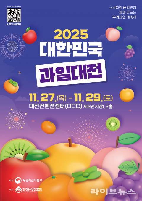 국산 과일 산업의 현재와 미래를 한자리에서 조망하는 ‘2025 대한민국 과일산업대전’이 오는 27일부터 29일까지 대전컨벤션센터(DCC) 제2전시장 1·2홀에서 열린다.