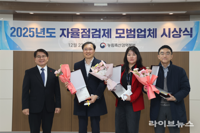 농림축산검역본부(본부장 최정록)는 23일 김천 검역본부에서 동물용의약(외)품과 의료기기(이하 동물용의약품등)의 제조·품질 관리 향상을 위한 2025년 자율점검제 모범업체 시상식을 갖고 모범업소 9개소를 시상했다고 밝혔다.