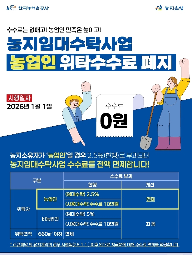 한국농어촌공사(사장 김인중, 이하 ‘공사’)는 2026년 1월 1일부터 농업인을 대상으로 ‘농지임대수탁사업’의 위탁수수료를 전면 폐지한다고 밝혔다.