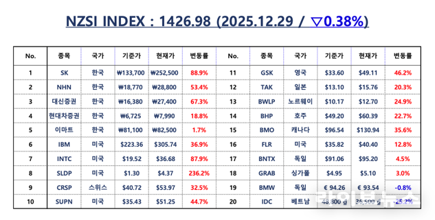 이날 NZSI INDEX는 0.38% 하락한 1,426.98포인트로 마감했다. 한국 대표 5개 종목의 누적 상승률은 48.10%(배당 포함 51.81%), 글로벌 대표 15개 종목의 누적 상승률은 40.90%(배당 포함 44.27%)로 집계됐다. 한국 시장의 장기 성과가 여전히 글로벌 시장을 앞서고 있으며, 그 격차가 다시 확대되는 흐름이 나타나고 있다.