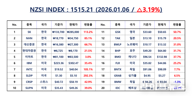 이날 NZSI INDEX는 3.19% 상승한 1,515.21포인트로 마감하며 3거래일 연속 상승 흐름을 이어갔다. 한국 대표 5개 종목의 누적 상승률은 59.96%였고, 배당을 포함한 총수익률은 63.67%로 집계됐다. 글로벌 대표 15개 종목은 누적 상승률 48.71%, 배당 포함 52.09%를 기록했다. 한국 시장의 성과 우위는 유지되고 있으며, 그 격차가 다시 확대되는 모습이다.