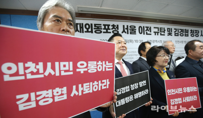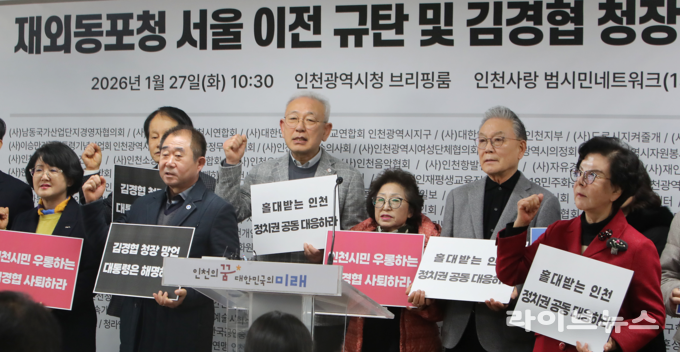 재외동포청의 서울 이전 검토 발언을 규탄하고 김경협 재외동포청장의 사퇴를 촉구하는 시민단체 기자회견이 27일 인천시청 브리핑룸에서 열렸다.
