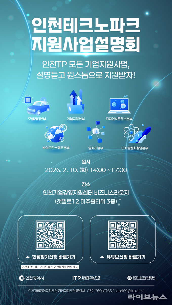 행사는 오는 10일 오후 2시부터 5시까지 진행되며, 미추홀타워 3층 인천기업경영지원센터 비즈니스라운지에서 현장 설명회가 열리고, 미추홀타워 20층 미추홀관에서는 온라인 생중계로도 병행 운영된다.