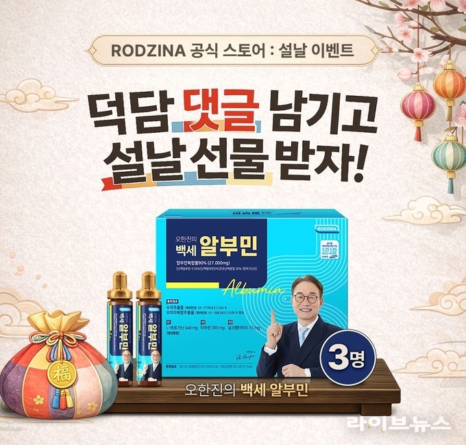 한편, 오한진의 백세 알부민 설날 댓글 이벤트는 네이버 로지나 공식스토어에서 단독으로 진행되며, 이벤트 참여 및 경품 증정과 관련된 자세한 사항은 이벤트 페이지 공지를 통해 확인할 수 있다.