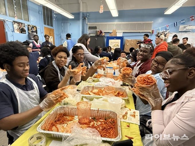 농림축산식품부(장관 송미령)와 한국농수산식품유통공사(aT, 사장 홍문표)는 지난 10일 뉴욕 맨해튼에 위치한 공립 고등학교에서 학생과 교직원 약 100명이 참가한 가운데 김치담그기 체험과 K-푸드 급식 행사를 개최했다.