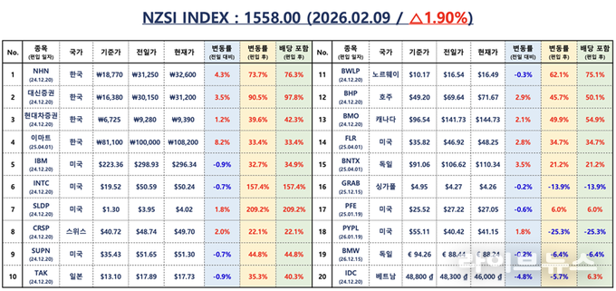 NZSI INDEX는 1.90% 상승한 1,558.00포인트를 기록하며 상승 추세를 이어갔다. 한국 대표 4개 종목은 78.25%, 배당 포함 81.95% 상승했고, 글로벌 대표 16개 종목은 48.75%, 배당 포함 52.12% 상승했다. 구조적으로 현금흐름과 주주환원 정책이 결합된 종목들이 지수를 견인하고 있는 흐름이다.