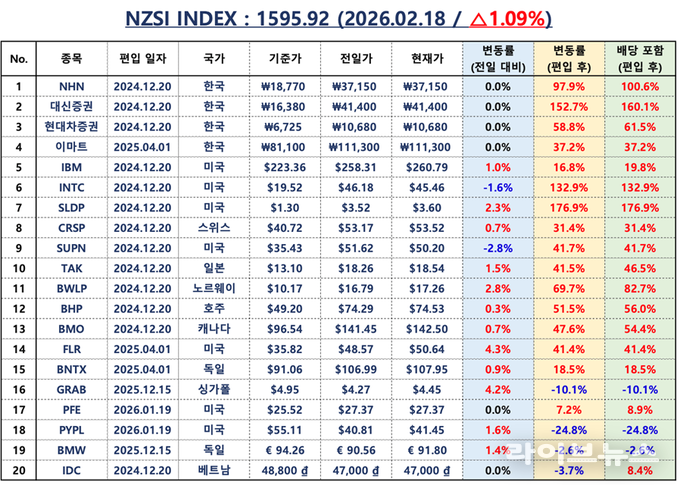 NZSI INDEX는 1.09% 상승한 1,595.92포인트를 기록하며 상승 흐름을 이어갔다. 한국 대표 4개 종목은 105.63%, 배당 포함 기준 109.33% 상승을 기록하고 있으며 글로벌 대표 16개 종목 상승률 46.65%, 배당 포함 50.28%를 2배 이상 크게 상회하고 있다. 이는 단순한 유동성 장세가 아니라 구조적 경쟁력을 갖춘 기업으로 자본이 집중되는 흐름이 강화되고 있음을 보여준다.