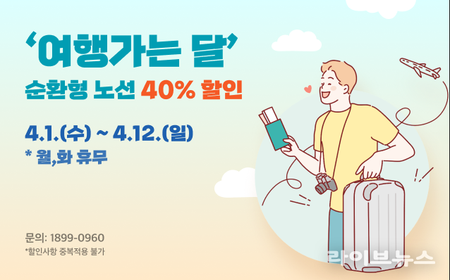인천시는 인천관광공사와 함께 올해 여행가는 달을 맞아 오는 4월 1일부터 12일까지 인천시티투어 순환형 노선을 이용하는 관광객에게 40% 할인 혜택을 제공한다고 밝혔다.