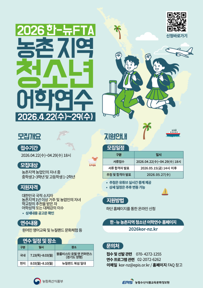농림수산식품교육문화정보원(원장 윤동진, 이하 농정원)은 4월 8일부터 4월 29일까지 ‘2026년 한-뉴 FTA 농업협력사업 농촌지역 청소년 어학연수’ 참가자를 모집한다.