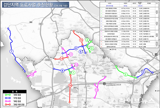 검단 지역에서는 검단양촌IC~봉수대로, 금곡동~대곡동 구간 등 총 16개 도로사업이 추진된다.