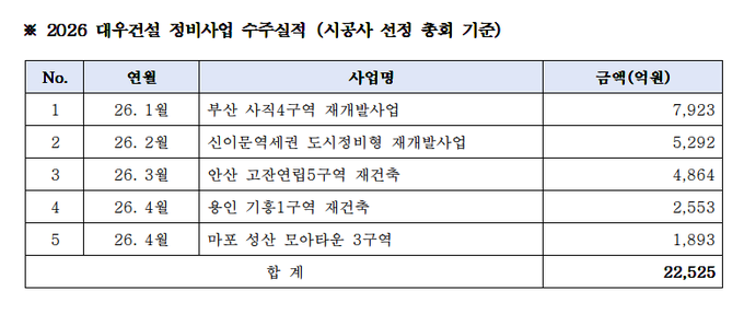 대우건설(대표이사 김보현)이 지난 주말 용인과 서울 마포 두 곳의 정비사업 시공사 선정총회에서 조합원들의 압도적인 지지를 받으며 올해 누적 수주액 2조 원을 넘어섰다. 대우건설은 현재까지 총 5개 사업장에서 2조 2,525억 원의 수주고를 올리며 2026년 상반기 정비사업 시장에서 업계 1위를 기록하고 있다.