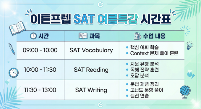 또한 학원 측은 올해 SAT 시험 일정과 여름특강 스케줄을 정리한 표를 제공해 학부모와 학생들이 체계적으로 준비할 수 있도록 돕는다. Reading&Writing 기본기 강화, 고난도 문제 풀이, 실전 모의고사와 시간 관리 훈련으로 구성된다. 수강생들은 여름방학 동안 집중 학습을 통해 50점 이상 점수 향상을 목표로 할 수 있으며, 별도의 에세이 첨삭 서비스도 제공된다.
