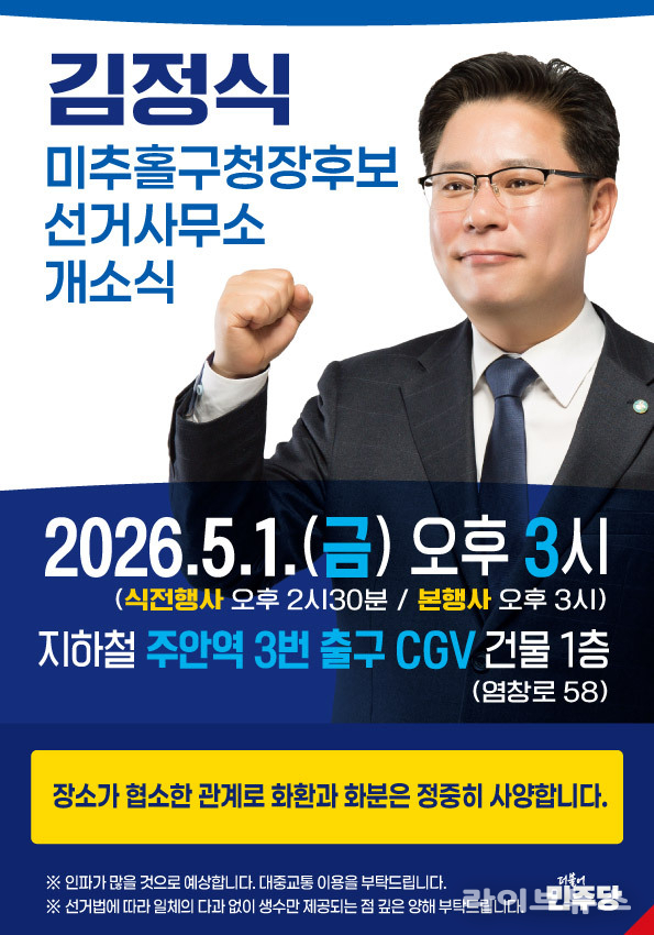 김정식 후보 측에 따르면 개소식은 오는 5월 1일 오후 3시, 인천 미추홀구 염창로 58 주안CGV 건물 1층에서 개최될 예정이다.