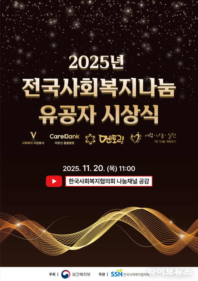 보건복지부와 한국사회복지협의회가 20일 서울 용산구 전쟁기념관 피스앤파크컨벤션 로얄홀에서 올해 전국사회복지나눔 유공자 시상식’을 열고, 한 해 동안 지역사회 돌봄과 나눔문화 확산에 기여한 개인·단체 114명에게 포상을 수여한다.