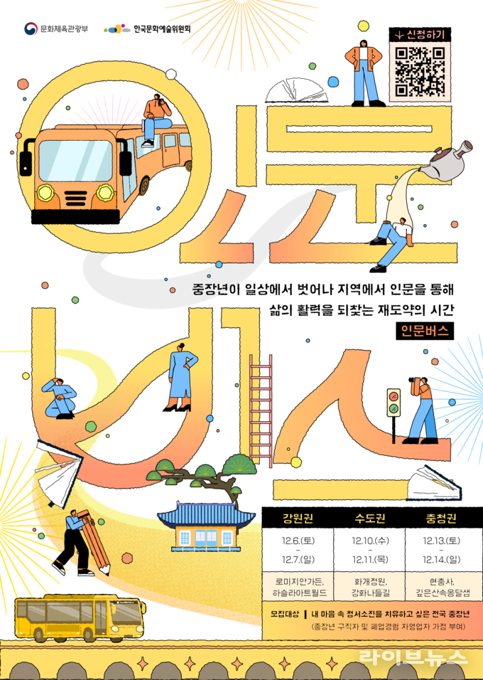 한편, 문체부와 아르코는 영남권 인문열차와 더불어 강원권·수도권·충청권에서 ‘인문버스’ 프로그램을 함께 운영한다. 인문버스는 전국 중장년(만 40세 이상 64세 이하)을 대상으로 하며, 중장년이 인문을 통해 삶의 활력을 되찾고 재도약의 전환점을 마련하는 것에 초점을 둔다. 특히, 중장년 구직자와 폐업 경험 자영업자(폐업일시 기준: 2023년 1월 1일 이후)에게는 가점을 부여해, 경제‧사회적 전환기에 놓인 이들의 참여를 적극적으로 독려한다.
