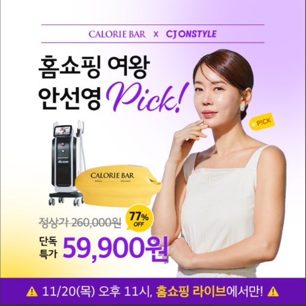 11월 20일 오후 10시 55분부터 약 1시간 동안 CJ온스타일에서 진행되는 이번 방송에서는 브랜드 CD 안선영이 칼로리바 다이어트의 서비스와 특장점을 설명하고, 브랜드 체험권을 할인 가격에 선보인다.