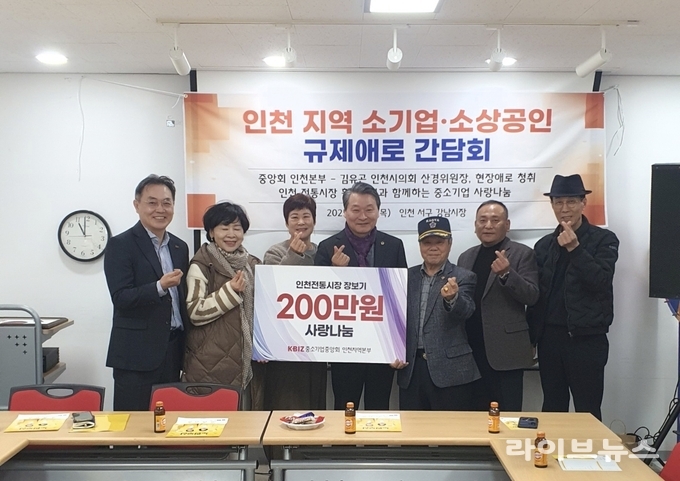 중소기업중앙회 인천지역본부는 20일 인천 강남시장에서 김유곤 인천시의회 산업경제위원장과 간담회를 열고 민생경제 활력 회복 방안을 논의했다.