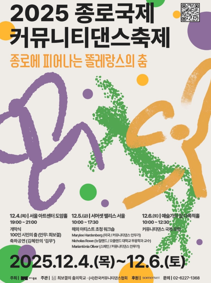 서울 종로가 겨울 초입, 춤으로 뜨거워진다. 국내외 커뮤니티댄스 예술가와 시민들이 함께 호흡하는 ‘2025 종로국제커뮤니티댄스축제’가 오는 12월 4일부터 6일까지 종로 일대에서 펼쳐지며, 예술이 일상과 만나는 특별한 현장을 선보인다.