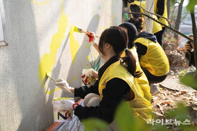 봉사단은 노후화된 외벽에 벽화를 직접 그려 생기를 불어넣는 한편 낙엽으로 인한 미끄럼 사고를 방지하기 위해 시설 내·외부 환경을 정비하는 작업에도 힘을 보탰다.