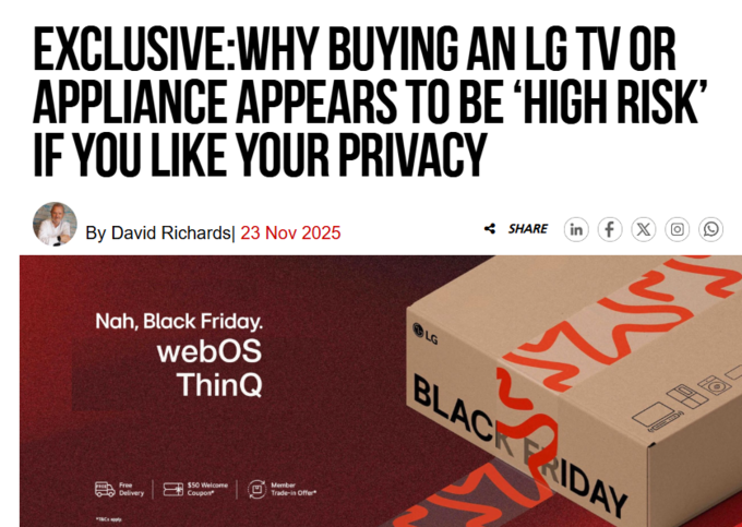 호주 유력 IT 전문매체 ChannelNews는 최근 보도에서 “LG TV나 가전제품을 구매하는 것이 개인정보 보호를 중시하는 소비자에게 ‘고위험’ 선택이 되고 있다”고 지적했다. 이 매체에 따르면 최신 webOS 업데이트 이후, LG TV 사용자들은 TV 전원을 끈 상태에서 방송을 녹화하는 기능(PVR)이 더 이상 작동하지 않는다고 호소하고 있다.