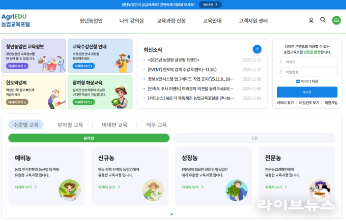 한편, 농정원 농업교육포털은 600개 이상의 온라인 교육과정을 제공하며, 매년 50만 건 이상의 교육 수료 실적을 기록하고 있다.