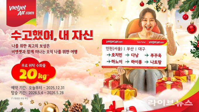 특히, 오는 12월 31일까지 비엣젯항공 공식홈페이지와 모바일 앱, 여행사를 통해 한국-베트남 노선 항공권을 예약하는 승객에게는 추가로 20kg의 무료 위탁 수하물이 제공된다. 해당 프로모션은 2026년 5월 4일부터 5월 28일까지의 항공편에 유효하다.