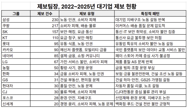 삼성(230건)과 쿠팡(217건)이 가장 많은 제보 건수를 기록했다. 삼성은 직장 내 괴롭힘과 성추행 등 노동·인권 문제와 함께 품질·안전 문제에서 반복적인 불만이 제기되어 글로벌 제조업체로서 노동자 권익 보호와 품질 관리가 핵심 과제로 부각되었다고 분석했다.