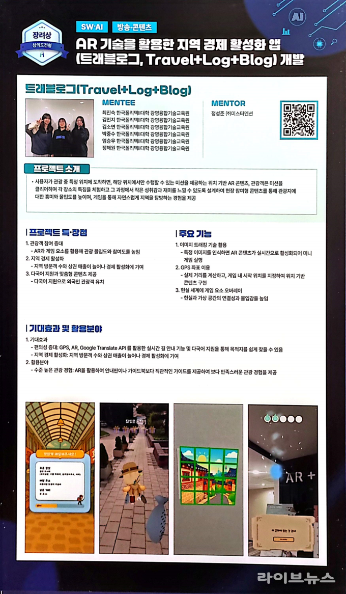 광명폴리텍대학 증강현실시스템과 하이테크과정 학생들이 과학기술정보통신부 주최 ‘2025 한이음 드림업 공모전’에서 장려상을 수상하며 지역경제 활성화에 기여할 기술력을 입증했다.