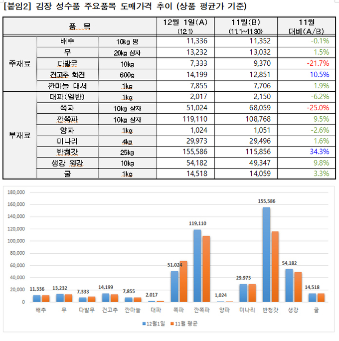 12월 1일 배추가격 11월 평균 대비 0.1% 감소, 무 1.5% 증가