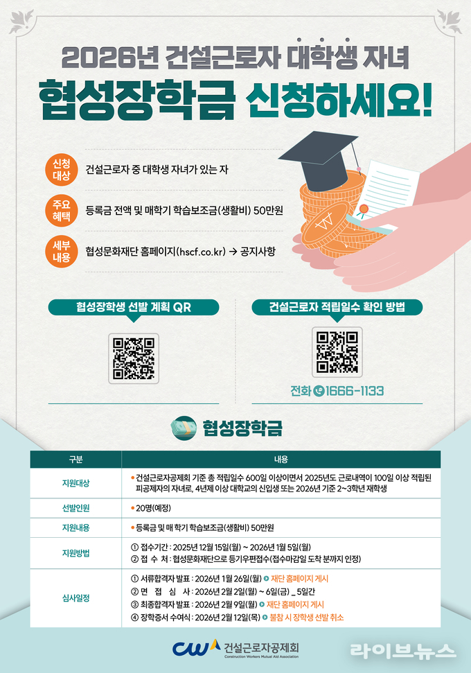 권혁태 이사장 직무대행은 “협성장학생 선발은 건설근로자의 장기근속을 장려하는 동시에, 현장에서 흘린 땀의 가치를 교육 지원으로 되돌려주는 모범적 협력사업”이라며 “앞으로도 건설근로자를 위한 다양한 복지 서비스를 확대해 나가겠다”고 말했다.