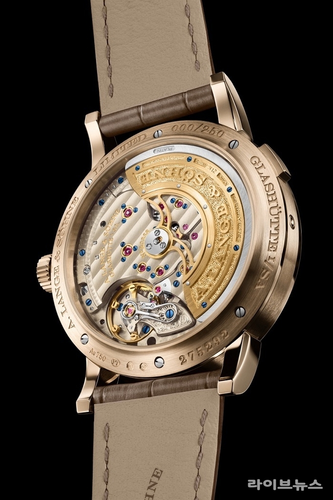 진동 시스템은 인덱스가 없는 대형 밸런스 휠과 매뉴팩쳐에서 자체 제작한 밸런스 스프링을 중심으로 시간당 21,600회 진동한다. 426개 부품으로 구성된 L021.1 무브먼트는 랑에 운트 죄네 전통에 따라 두 번 조립되었으며, 사파이어 크리스털 케이스백을 통해 수공 인그레이빙된 밸런스 콕, 글라슈테 리빙 장식, 스크류 고정 골드 샤통 등의 특징을 확인할 수 있다.