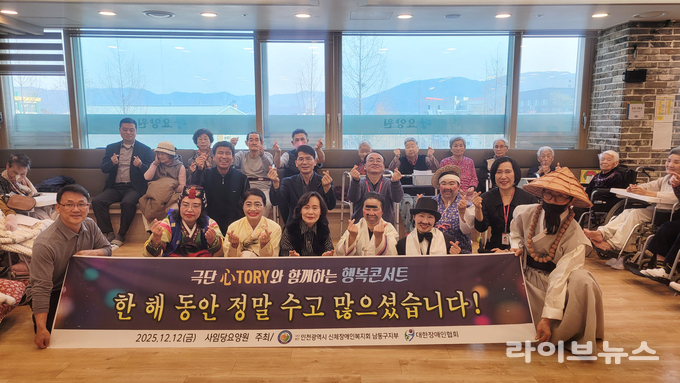 인천신체장애인복지회 남동구지부와 대한장애인협회 회원들로 구성된 장애인·비장애인 동아리 ‘극단 심토리’는 지난 12일 경기도 포천시 사임당요양원에서 연말 행복콘서트를 열고 정성과 공감이 담긴 공연을 선보였다.