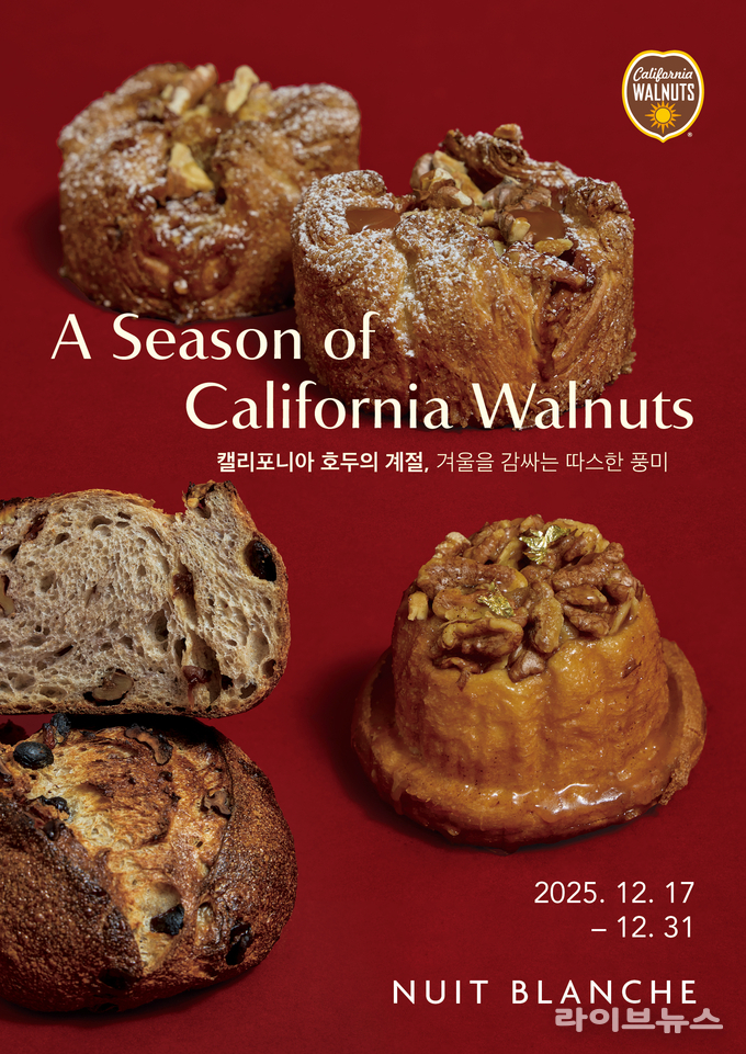캘리포니아 호두협회(California Walnut Commission)는 올 겨울, 서울의 인기 베이커리·디저트 숍과 함께하는 겨울 시즌 한정 팝업 ‘A Season of California Walnuts’를 오는 12월 17일부터 31일까지 진행한다. 이번 팝업에서는 겨울 분위기와 잘 어울리는 시즌 한정 호두 디저트를 선보이며, 소비자들에게 새로운 미식 경험을 제공하는 것을 목표로 하고 있다.