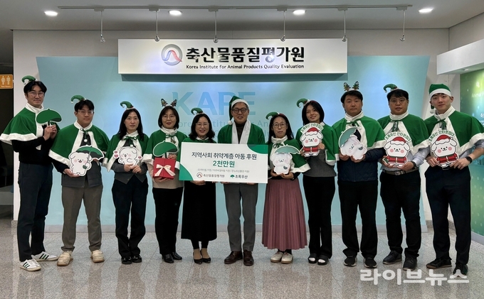 축산물품질평가원(원장 박병홍)은 16일, 연말을 맞아 임직원의 자발적 참여로 마련된 사회공헌 성금 2천만 원을 아동 복지 전문 기관인 초록우산 어린이재단 세종지역본부(본부장 박미애)에 전달했다.