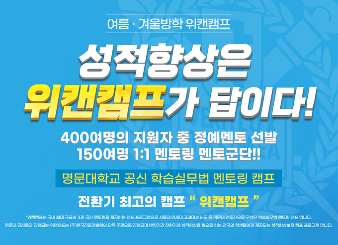 국내 최대 규모의 서울대 멘토진이 참여해 성적 향상 멘토링을 강화하는 위캔캠프의 이번 겨울방학캠프는 서울대학교 관악캠퍼스와 국제청소년센터에서 2박 3일간 진행되며, 중학생 1학년부터 고등학생 3학년까지 누구나 신청할 수 있다.