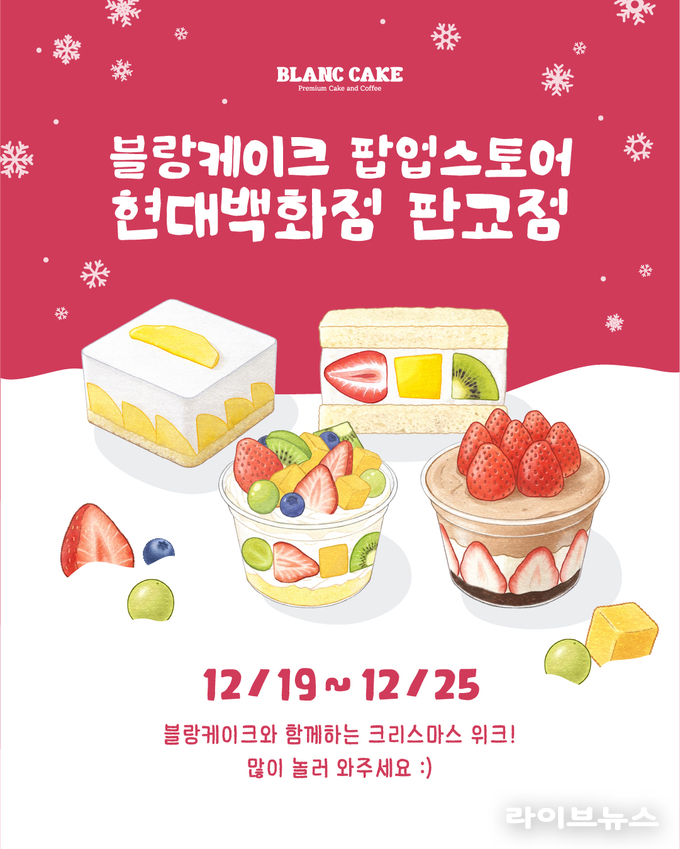 프리미엄 생과일 케이크 브랜드 블랑케이크가 크리스마스와 연말 시즌을 맞아 현대백화점 판교점 지하 1층에서 팝업스토어를 선보인다. 이번 팝업은 2025년 12월 19일(금)부터 12월 25일(목)까지 운영된다.