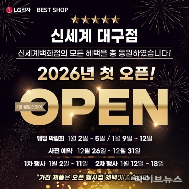 LG전자 베스트샵 신세계 대구점 관계자는 "2026년 새해를 맞이해 오픈 행사점만이 드릴 수 있는 특별한 혜택과 사은품을 준비했다. 특히 결혼가전 및 혼수가전을 준비하는 예비부부 및 입주/이사가전 고객에게는 더욱 도움이 되는 행사가 될 것"이라고 전했다.