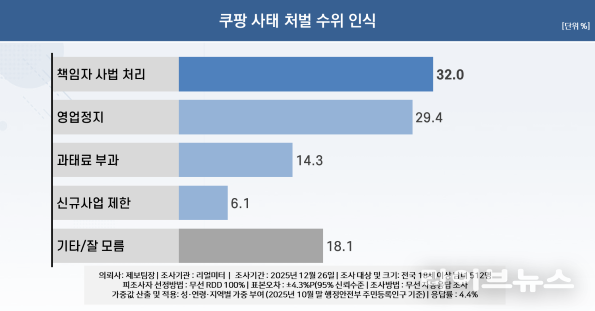 쿠팡에 대한 적절한 처벌 수위를 묻는 질문에는 ‘책임자 사법처리’가 32.0%로 오차범위 내에서 가장 높은 비율을 차지했으며, ‘영업정지’(29.4%)가 그 뒤를 이었다. 이어 ‘과태료 부과’(14.3%), ‘신규사업 제한’(6.1%) 순으로 나타나, 단순한 금전적 처벌보다는 실질적인 책임 추궁과 강도 높은 행정 처분을 원하는 목소리가 컸다.