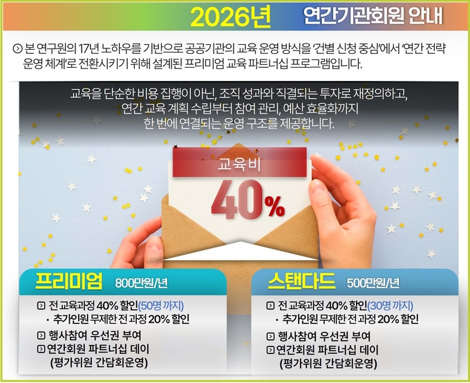 한국공공기관연구원은 「기관장 경영계약서 작성전략」을 포함해, 「총인건비 인상률 산출 및 지표관리 과정」, 「주요사업 지표 마스터 향상 교육」 등 공공기관의 실무와 평가 흐름에 맞춘 교육을 연속적으로 운영할 예정이다.